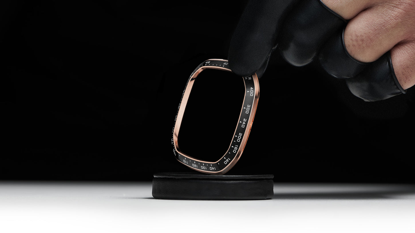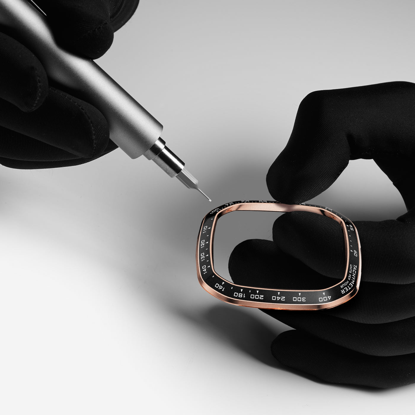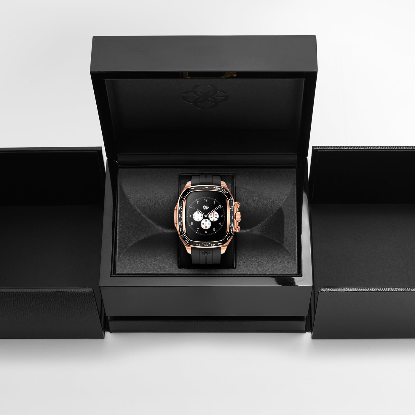 The Crown Edition redefines the traditional watch case with a bold design shift, relocating the crown to the center of the right side for enhanced aesthetics and functionality. Precision engineering ensures the Apple Watch crown remains fully operational in its new position, delivering a seamless user experience. The ceramic bezel, featuring a tachymeter scale, is intricately engraved and hand-painted by skilled craftsmen, drawing inspiration from the precision of racing.