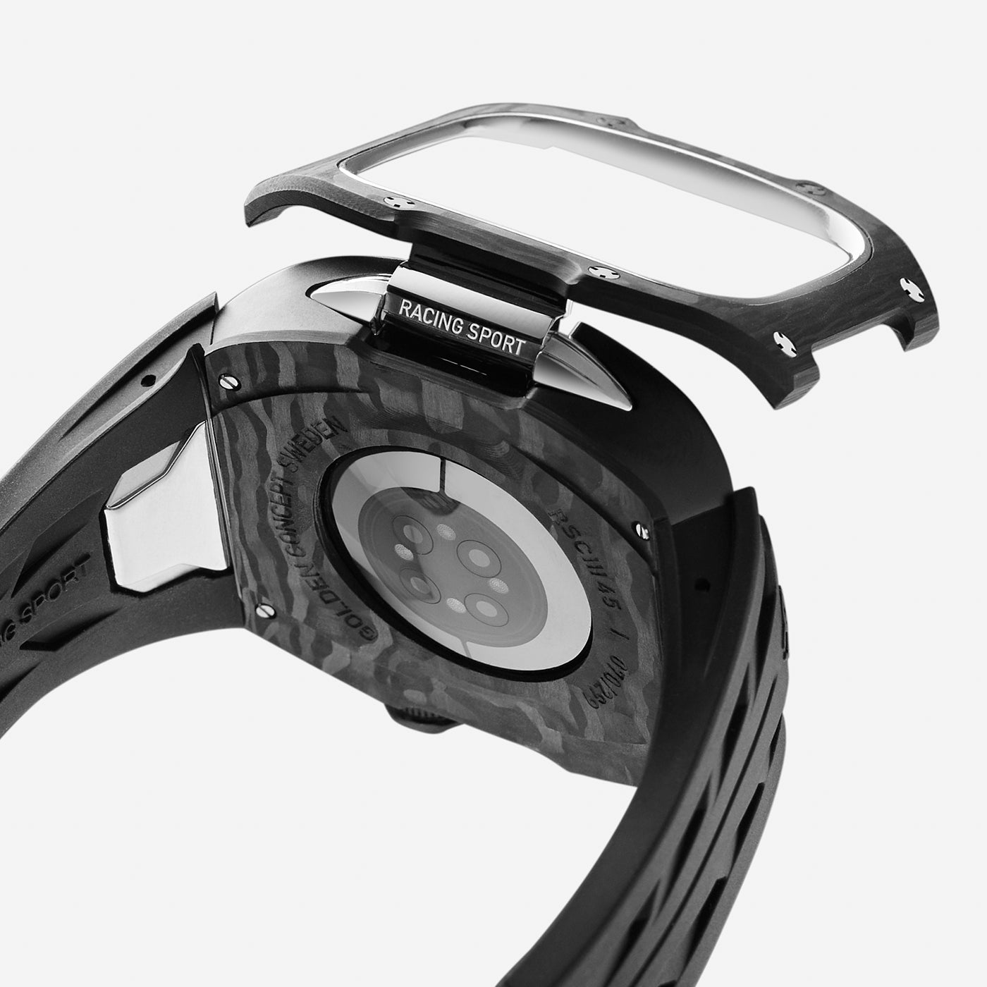 The Racing Sport Edition redefines convenience with its patented Hatch-Bezel® technology. This groundbreaking design allows for the effortless installation and removal of your Apple Watch at the push of a button.