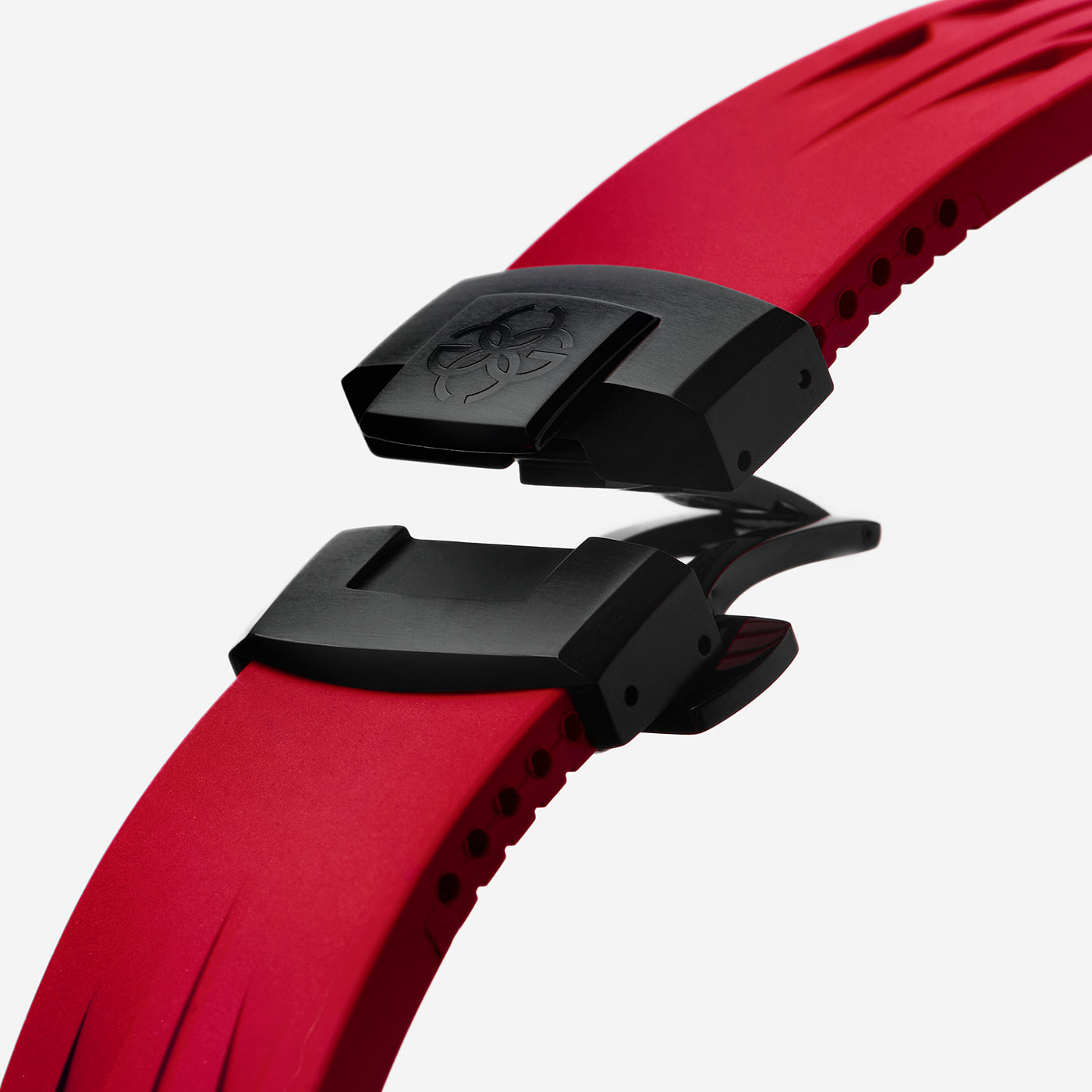 The Diablo features a jet black butterfly buckle, seamlessly complementing its sleek design. Paired with a fiery red strap, the contrast creates a striking aesthetic that sets the Diablo apart as a symbol of bold elegance and style.