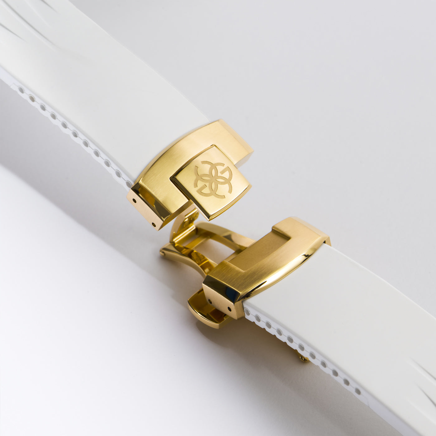 The Racing Sport watch features a striking golden butterfly clasp that enhances its streamlined design. Combined with a crisp white strap, this combination radiates charm, making the Racing Sport a symbol of timeless elegance and sophistication.