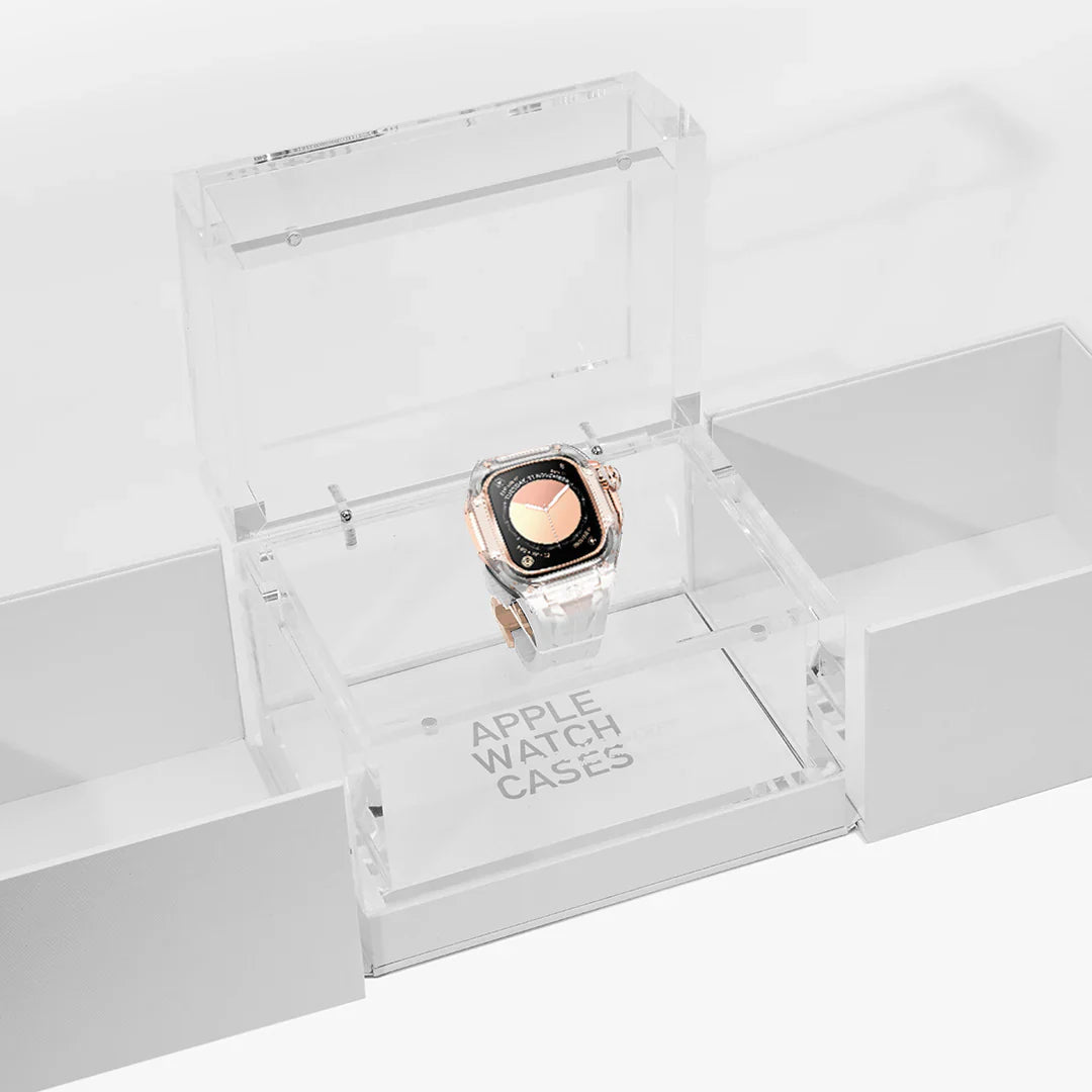 The watch case floats gracefully inside a pristine transparent box, designed to showcase exclusivity and modern sophistication. Its sleek, minimalist design ensures your timepiece stands out with clarity and contemporary allure.
