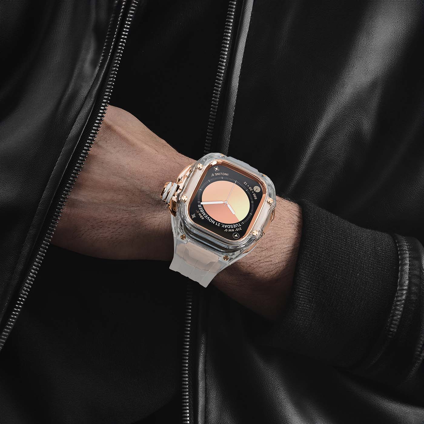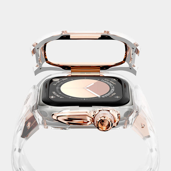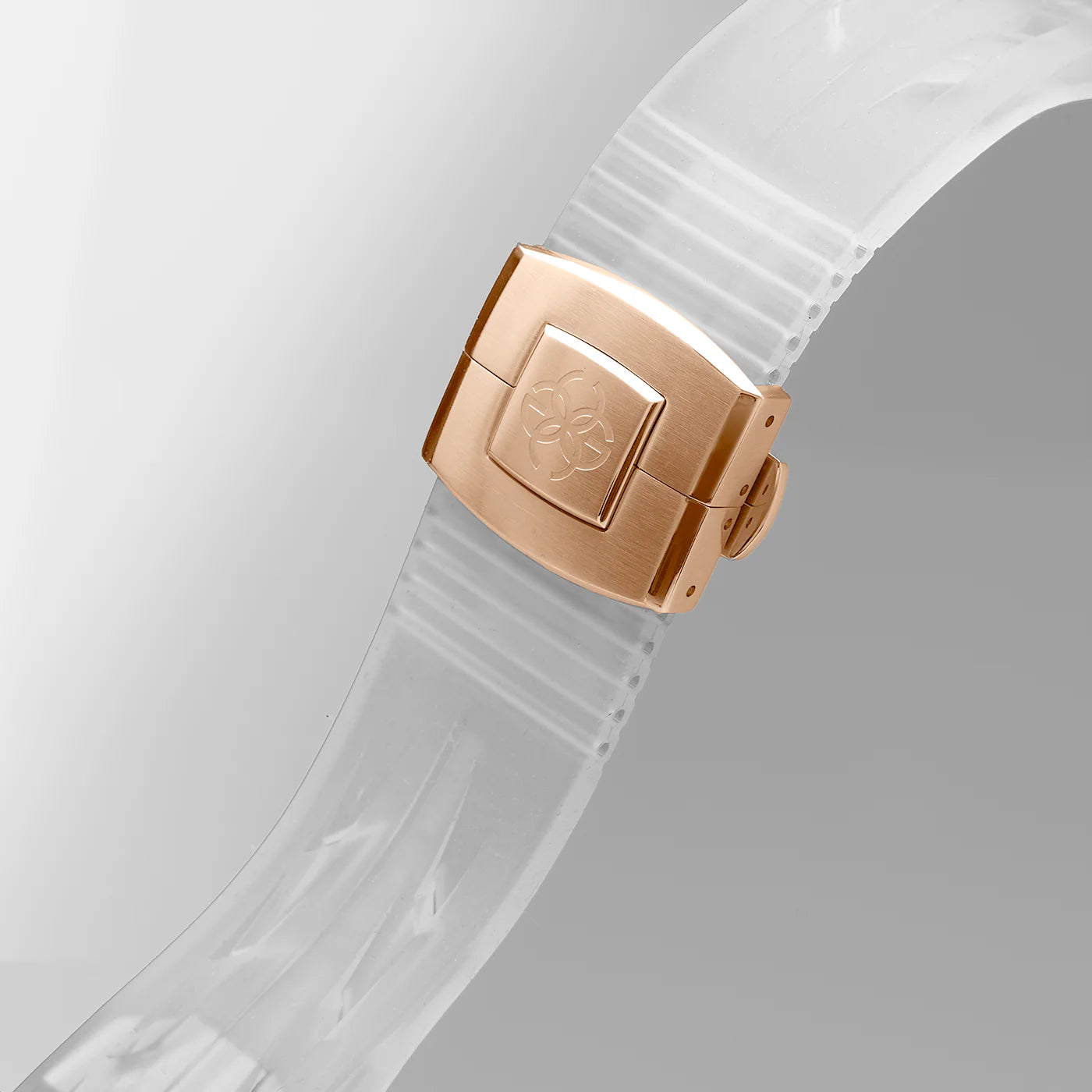 Made from high-density translucent silicone rubber, this updated Apple Watch strap is lightweight and flexible. Its transparent look and 18K rose gold plated titanium butterfly buckle ensure durability and elegance. With our new click-on strap function, switching colors is effortless.