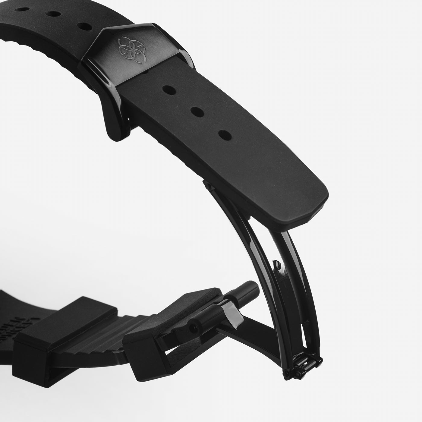 Our latest strap innovation is all about simplicity and durability. Made from top-grade fluoroelastomer for lasting comfort and equipped with a sturdy stainless steel mechanism, it's designed for quick and effortless attachment. Snap it on or off seamlessly, ideal for the active and practical user.