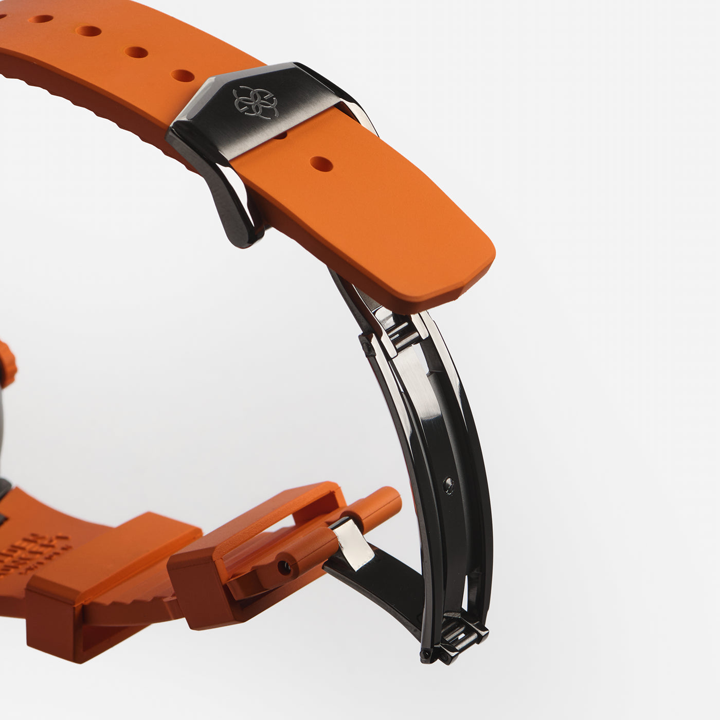 Our latest strap innovation is all about simplicity and durability. Made from top-grade fluoroelastomer for lasting comfort and equipped with a sturdy stainless steel mechanism, it's designed for quick and effortless attachment. Snap it on or off seamlessly, ideal for the active and practical user.