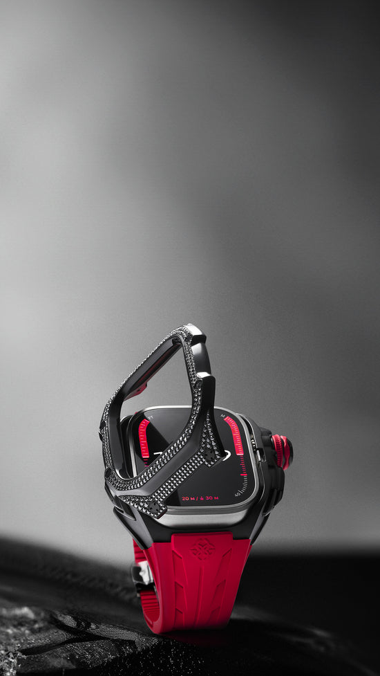 Indulge in the exquisite allure of the Diablo, adorned with captivating black Swarovski Zirconia crystals and featuring a flexible FKM rubber strap in a fiery red hue, accentuated by a deployant buckle. This luxurious 49mm case seamlessly blends elegance and functionality, ensuring you stand out from the crowd.