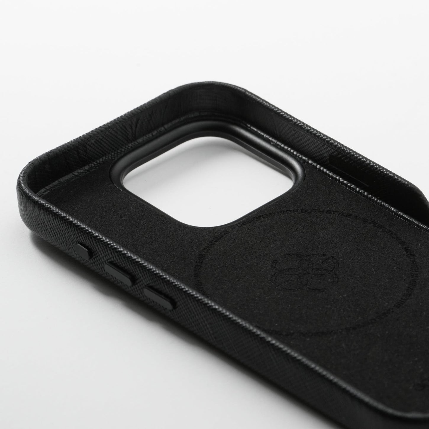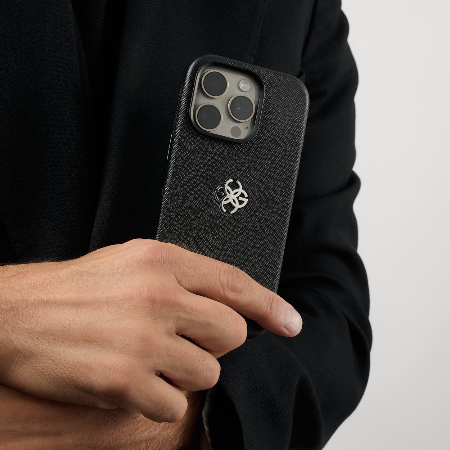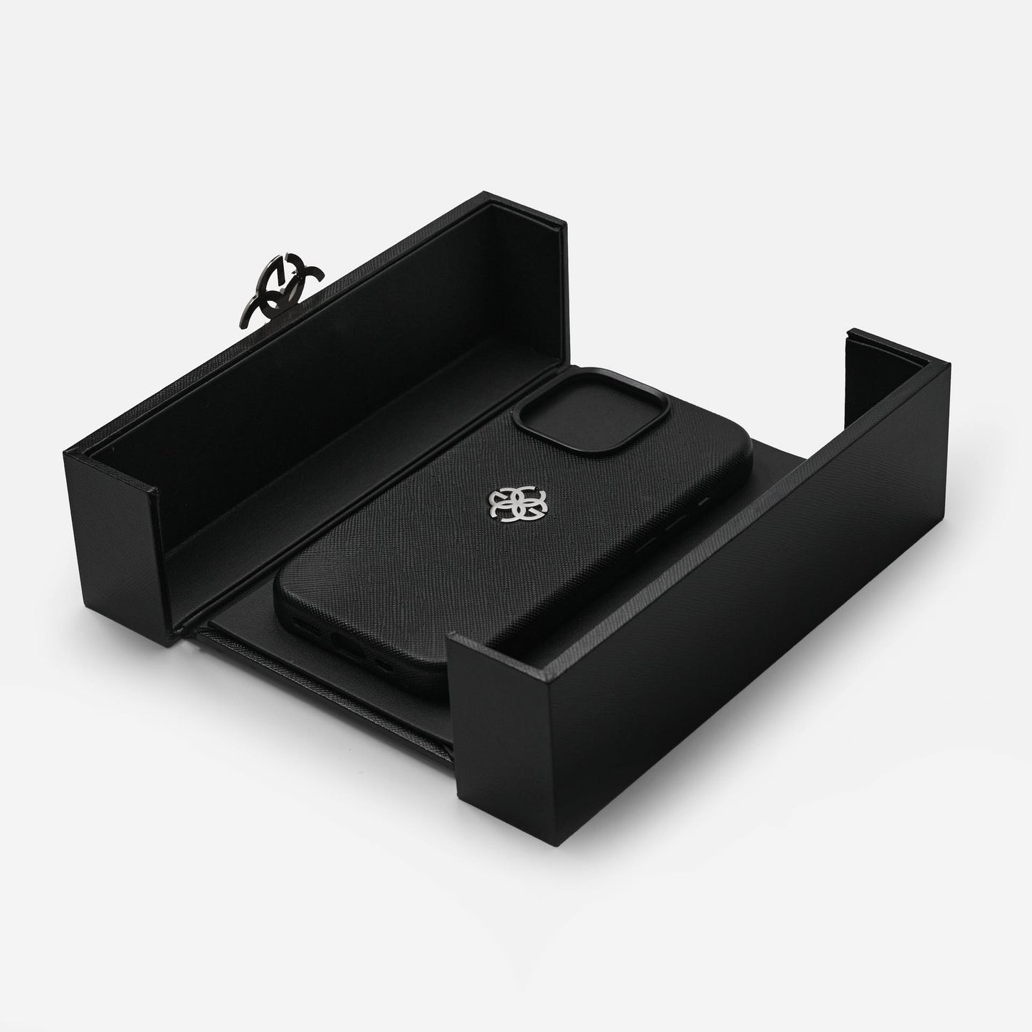 Elevate your iPhone with a case crafted from saffiano calf leather. This refined accessory seamlessly blends luxurious style with everyday practicality, providing a sophisticated look and durable protection in one elegant design.