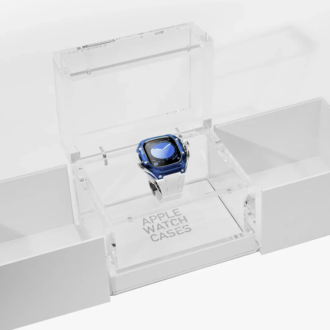 The watch case floats gracefully inside a pristine transparent box, designed to showcase exclusivity and modern sophistication. Its sleek, minimalist design ensures your timepiece stands out with clarity and contemporary allure.