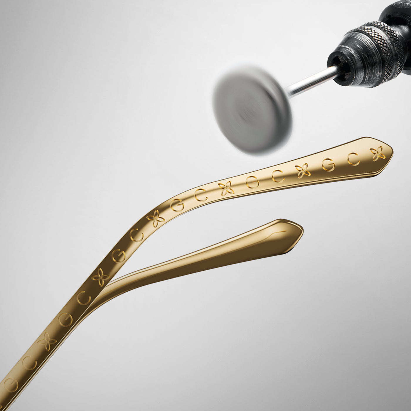 The sunglasses are crafted to be as exquisite as the finest precious jewelry. Utilizing the Guilloché technique, we created distinctive detailing on the temples, enhancing the elegance and uniqueness. The signature GC pattern flows seamlessly from the temple to the temple tip, enhancing the overall design. A GC logo adorns the end piece, making a subtle brand statement.