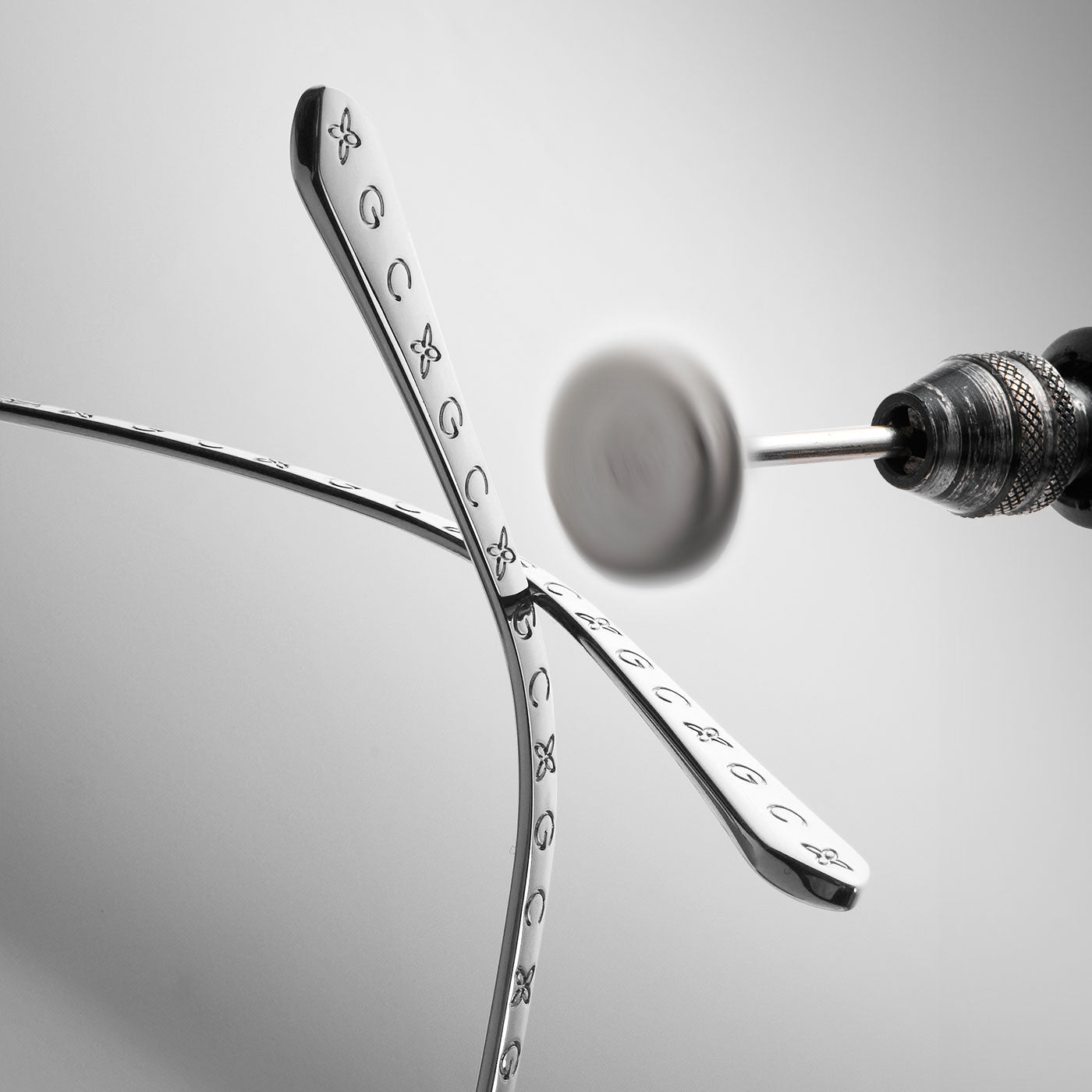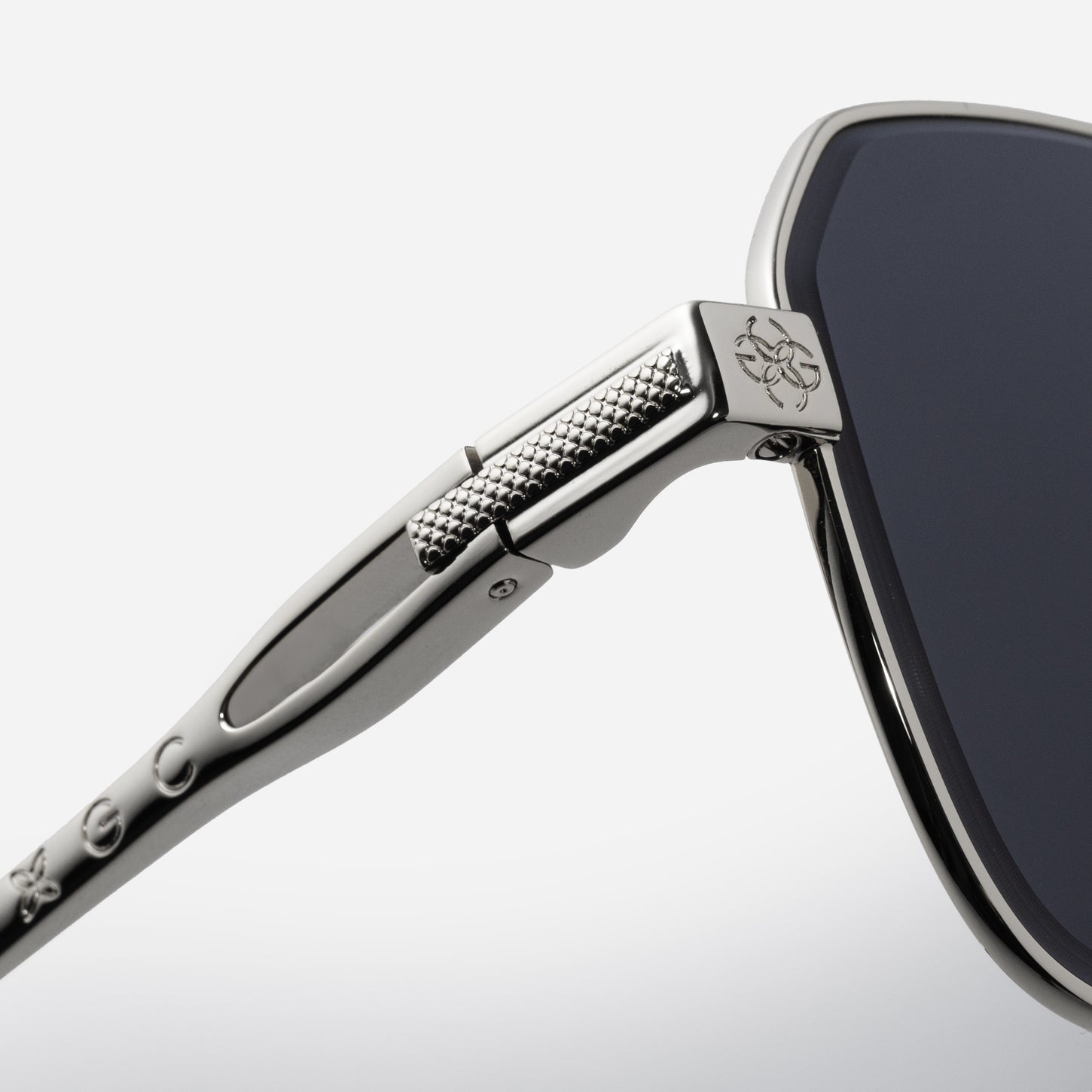 The sunglasses are crafted to be as exquisite as the finest precious jewelry. Utilizing the Guilloché technique, we created distinctive detailing on the temples, enhancing the elegance and uniqueness. The signature GC pattern flows seamlessly from the temple to the temple tip, enhancing the overall design. A GC logo adorns the end piece, making a subtle brand statement.