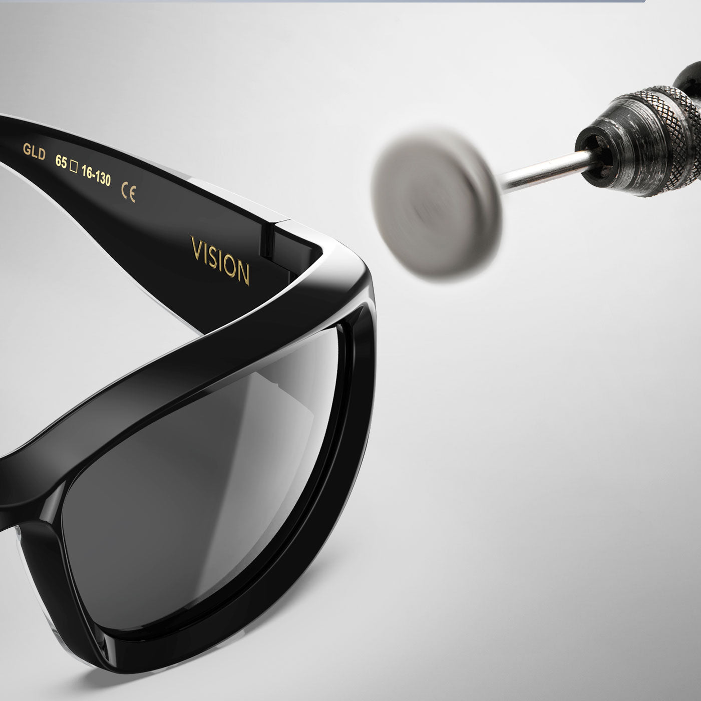 Vision feature a bold design with minimal accessories, creating a striking and confident look. While details are fewer, they are bold and contrasting, highlighting the precision and craftsmanship behind each pair. The mix of smooth facets and clear edges enhances their modern appeal. The signature GC logo is placed on the temple, remaining visible even when the sunglasses are folded.